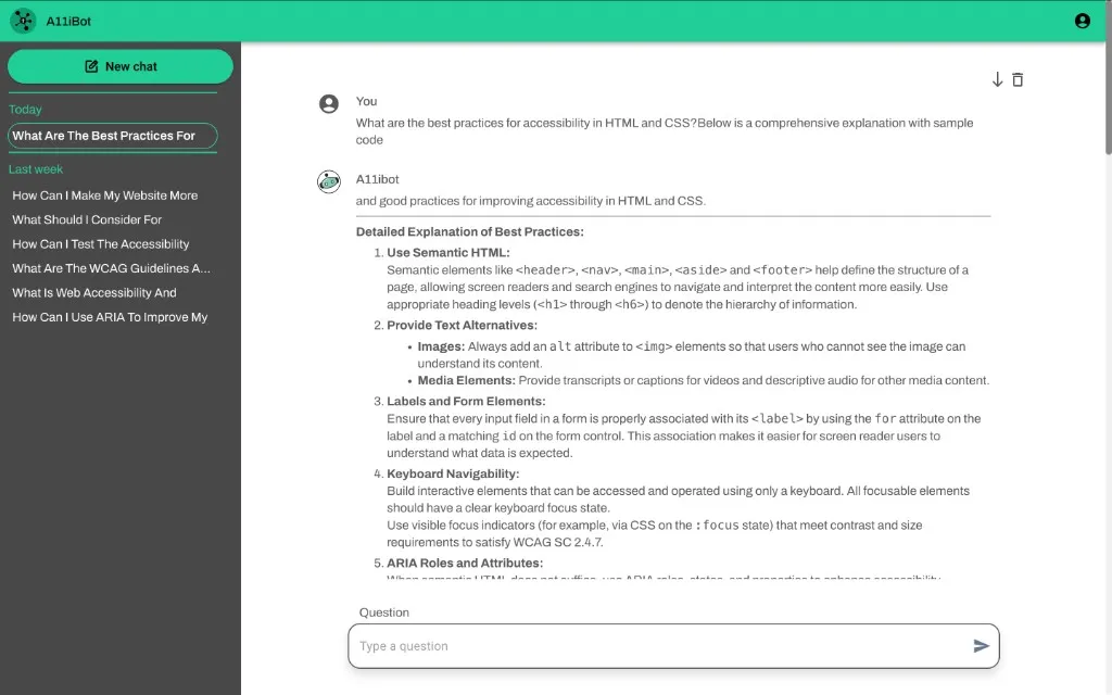 A11yAssist is a specialized accessibility assistant that answers WCAG, WAI-ARIA, and platform-specific questions in plain language — with code examples and references to official documentation.