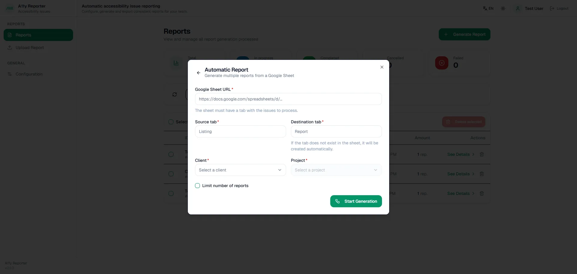 Generate multiple reports from a Google Sheet. Configure source/destination tabs, client and project, and optional limits.