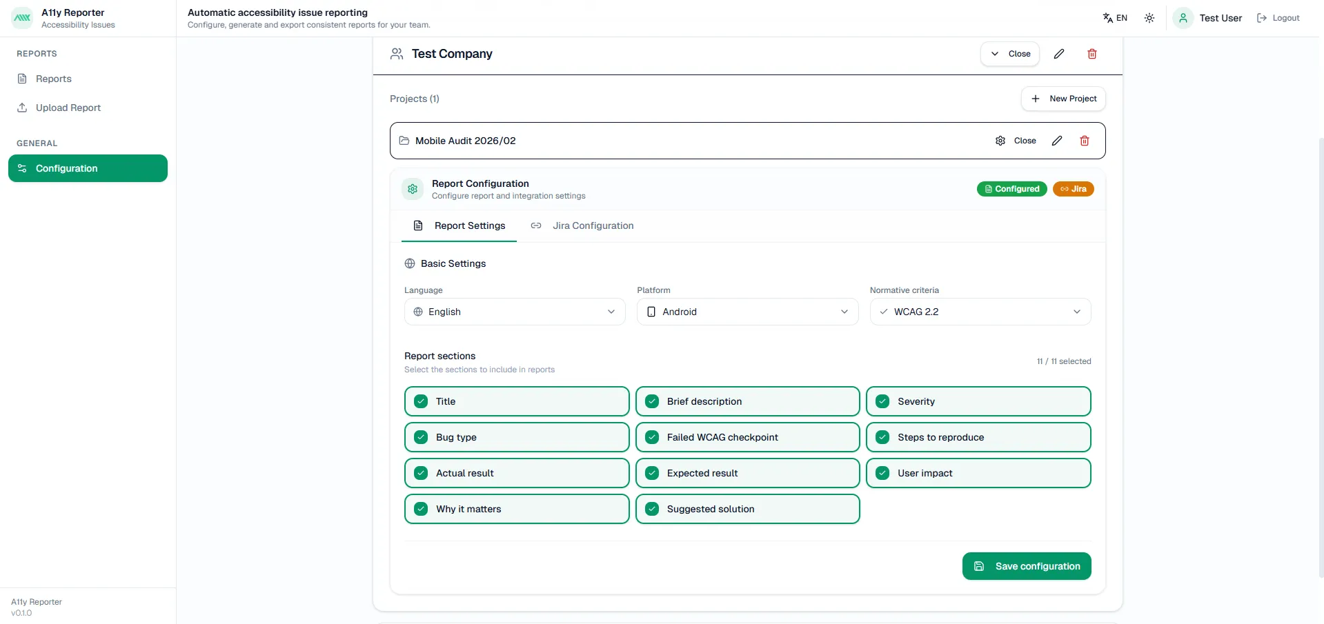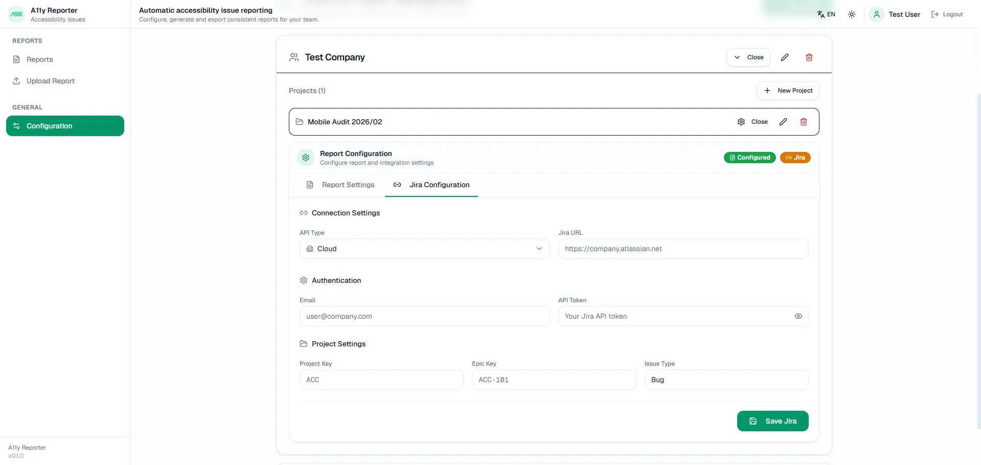 Define report fields (title, severity, WCAG checkpoint, etc.) and integrate with Jira for ticket creation.