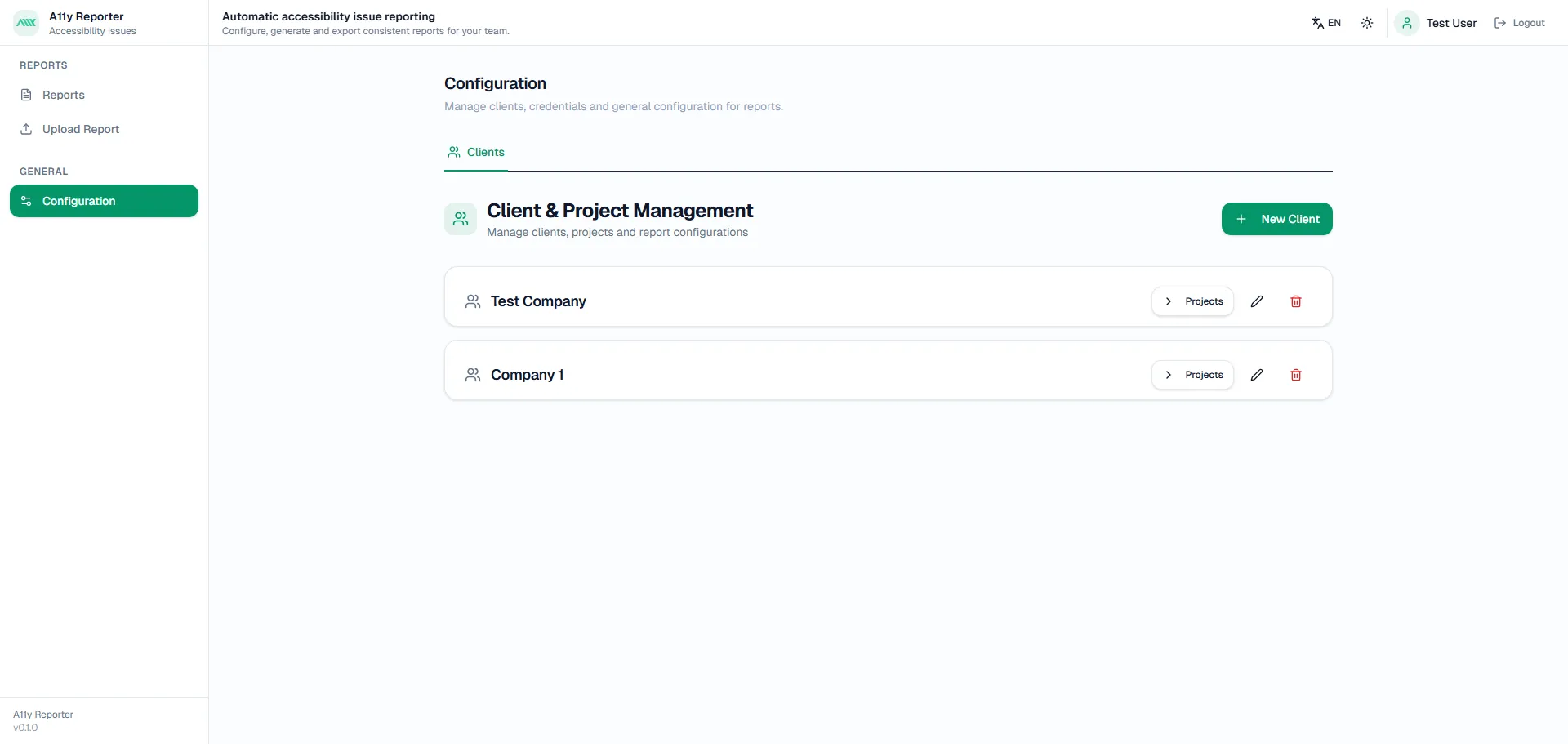 Manage clients, projects and report configurations. Set language, platform (Web, iOS, Android) and normative criteria.