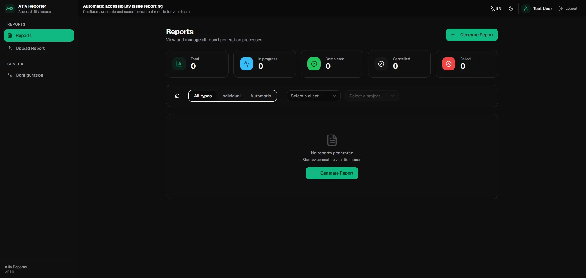 Overview of report statistics, filtering by type (All, Individual, Automatic), and quick action to generate your first report.