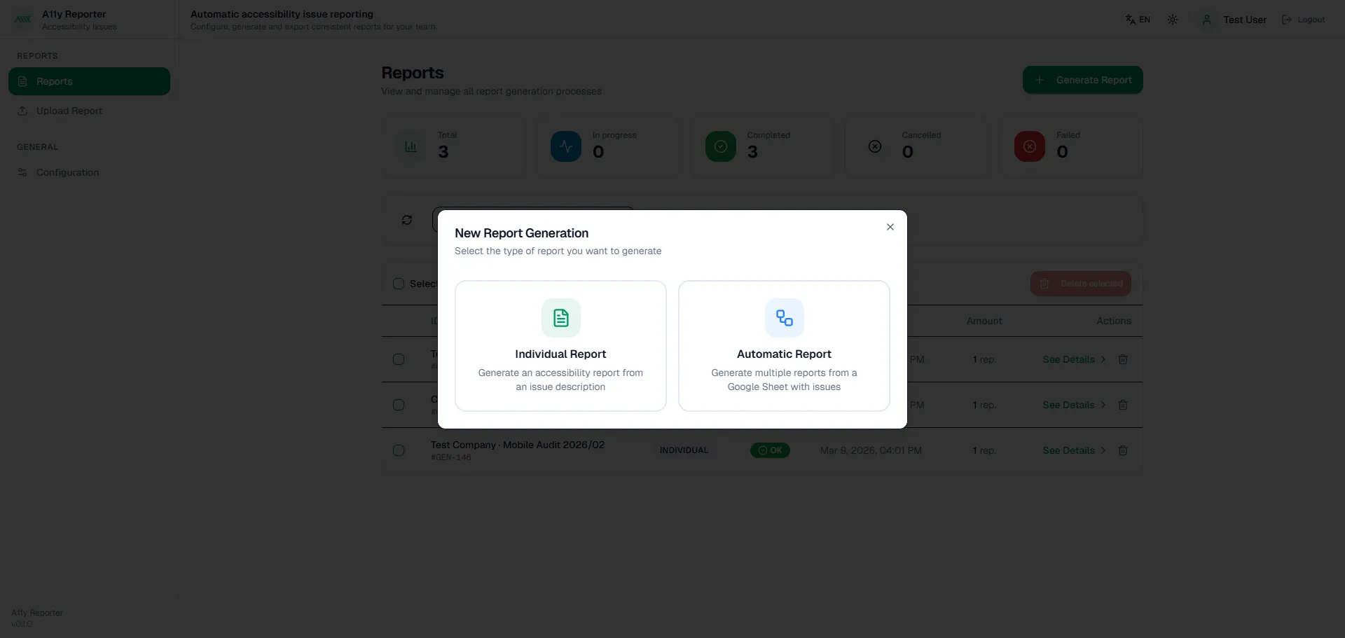 View and manage all report generation processes. Total, In progress, Completed. Filter by Individual or Automatic.