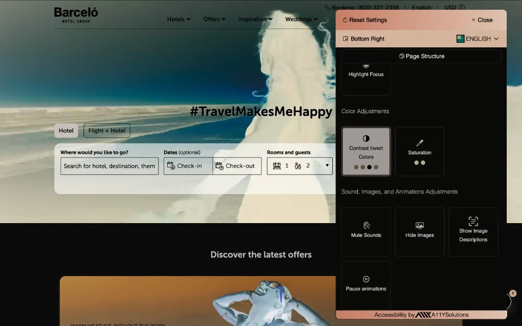 Color Adjustments (Contrast, Invert Colors, Saturation). Sound, Images, and Animations (mute, hide images, pause animations).