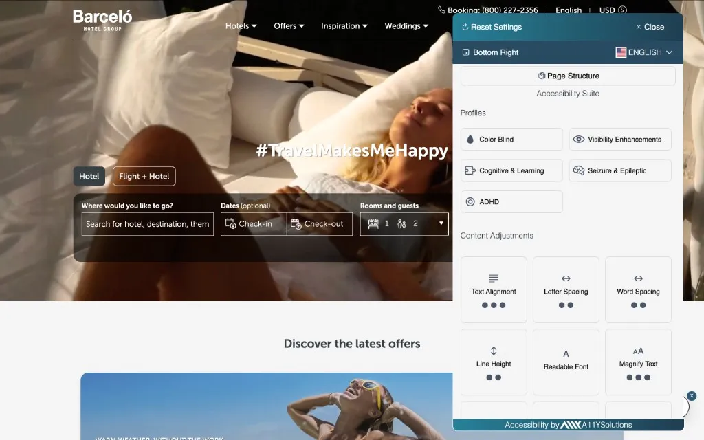 Accessibility Suite with Profiles (Color Blind, Visibility, Cognitive, ADHD) and Content Adjustments (text alignment, spacing, magnification).