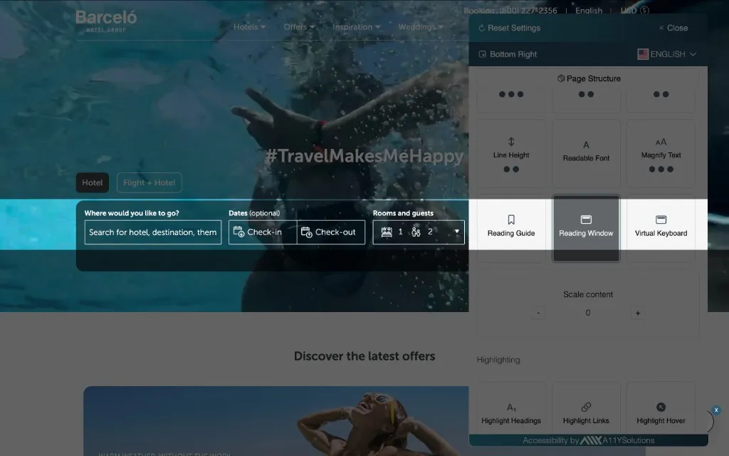 Page Structure tools—Reading Window, Reading Guide, Virtual Keyboard. Scale content and Highlighting (headings, links, hover).